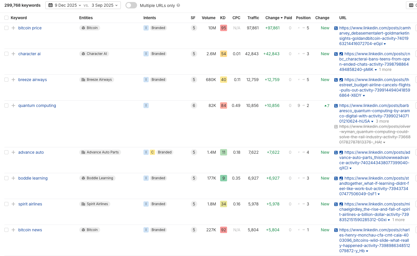 I also wanted to look a bit under the hood to see what types of queries social media platforms are performing well for. I started by looking at LinkedIn to see the biggest improvements when comparing December 2025 to September 2025.